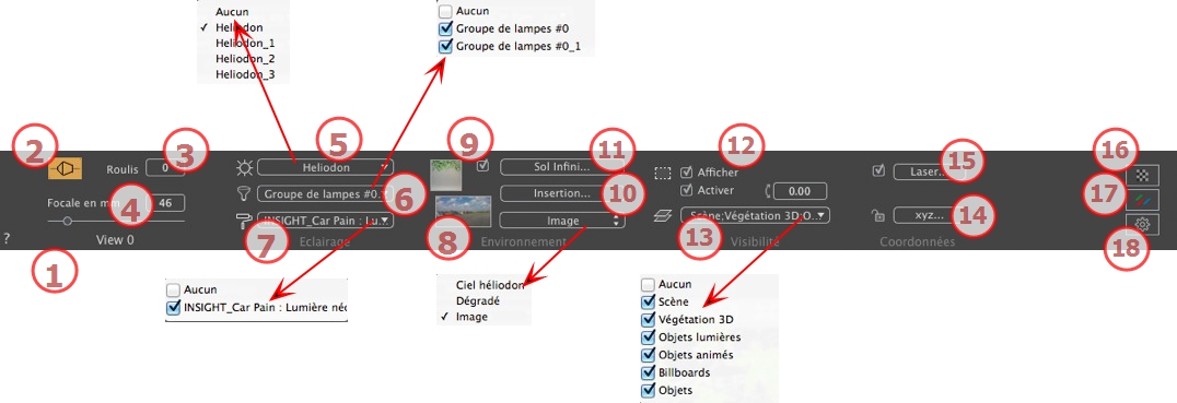 Inspecteur de perspectivesGère les points de vue définis par une caméra, une cible et une longueur de focale. Chaque point de vue est considéré comme un document autonome avec ses propres paramètres, pouvant recevoir son propre environnement.